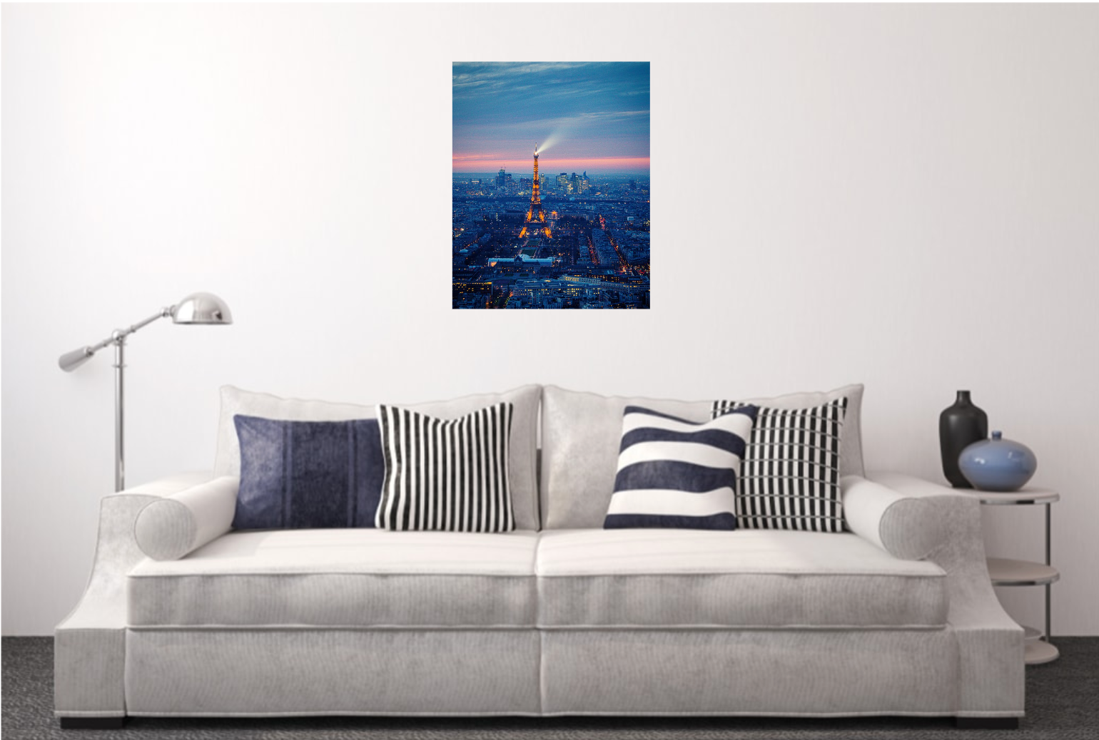 Atardecer sobre la Torre Eiffel, disponible en tamaño 50 x 70 cm.